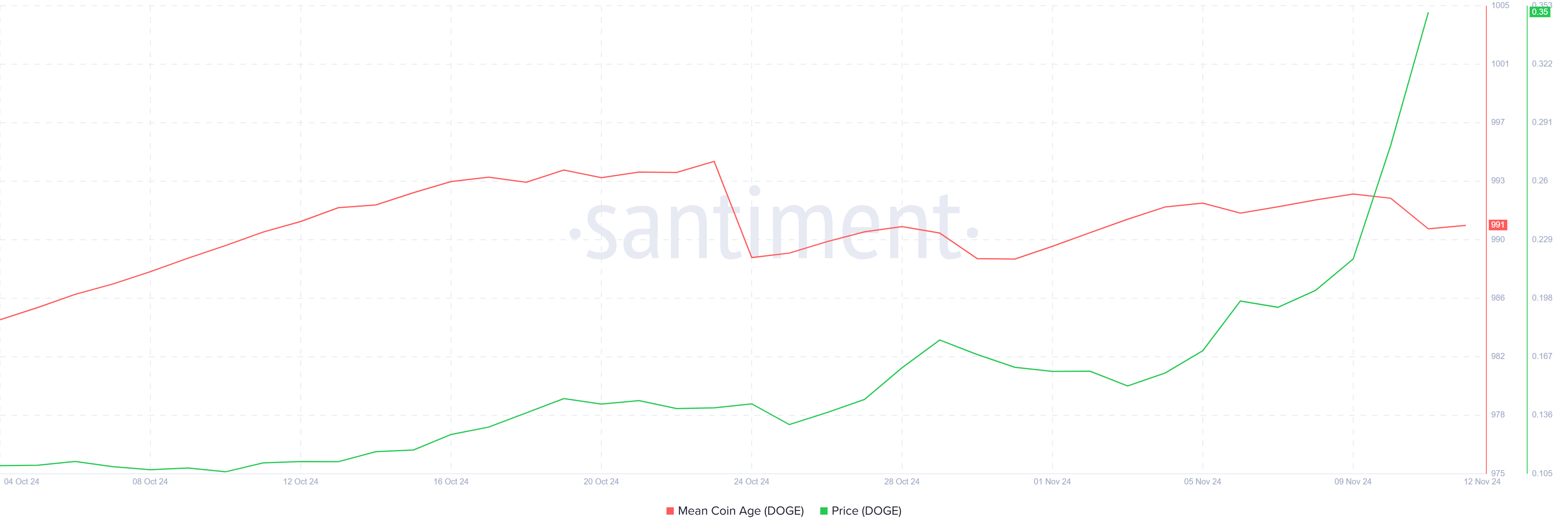 Il momento macro di Dogecoin mostra anche segni di incertezza, come indicato dalla metrica Mean Coin Age (MCA). Un aumento della MCA segnala che i detentori a lungo termine si astengono dal muovere i loro asset, riflettendo una forte convinzione nel mantenere. Tuttavia, la MCA di Dogecoin è attualmente in calo, suggerendo che alcuni detentori a lungo termine stanno muovendo o vendendo i loro asset, il che potrebbe aggiungere a una prospettiva ribassista.
