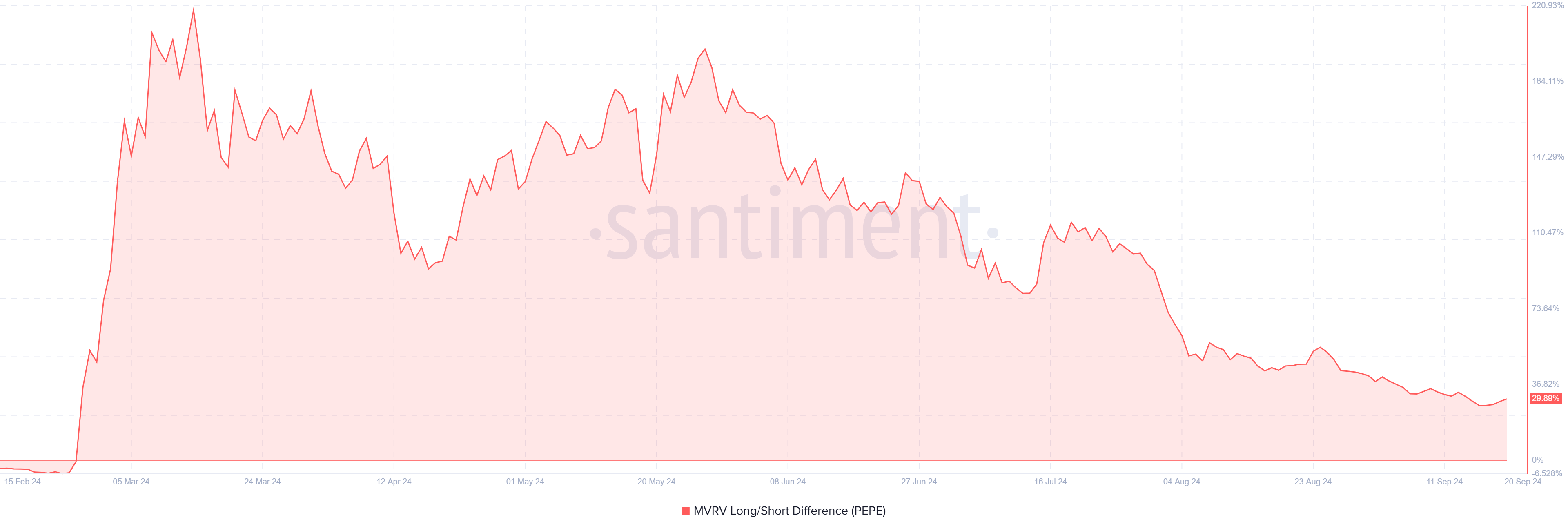 La differenza MVRV lungo/breve suggerisce che i detentori a lungo termine di PEPE sono in profitto. Questo indicatore misura se i detentori a lungo o a breve termine sono in profitto, segnalando a favore dei primi. Al 30%, l’indicatore mostra che i LTH sono altamente redditizi e, poiché questi investitori sono noti per il loro HODLing, potrebbero non decidere di vendere.