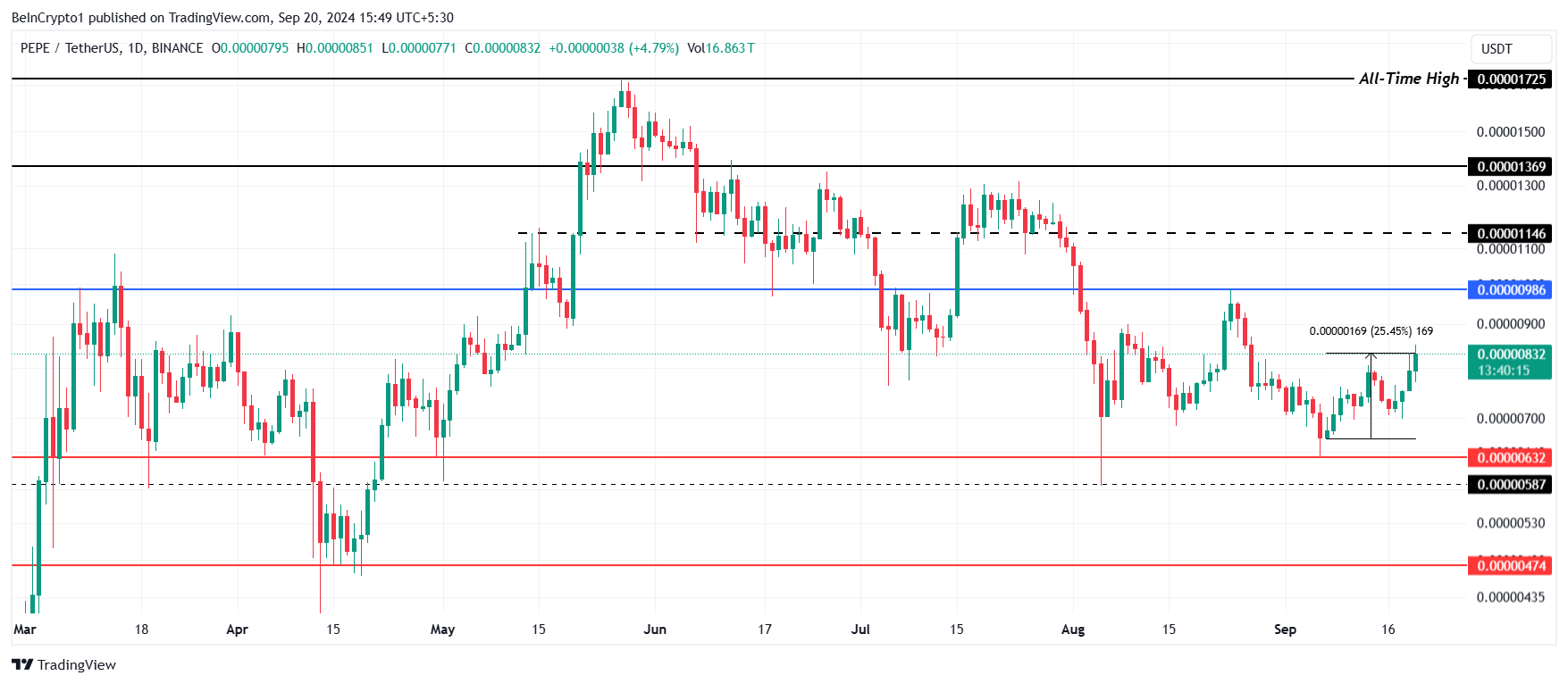 Il prezzo di PEPE ha avuto difficoltà a trovare stabilità dall’inizio di agosto. Tuttavia, le recenti azioni di prezzo mostrano un rinnovato slancio rialzista, offrendo speranza per il memecoin.