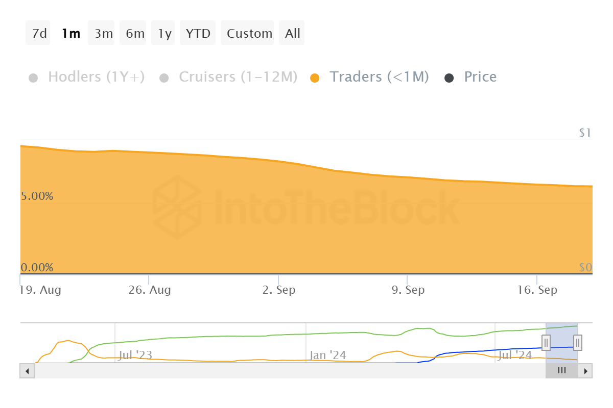 I detentori a breve termine di PEPE sono notevolmente diminuiti, con un calo del 21% da 23 000 a 18 000 dall’inizio del mese. Questi investitori, noti per detenere asset per meno di un mese e vendere rapidamente, hanno rappresentato una minaccia in passato.