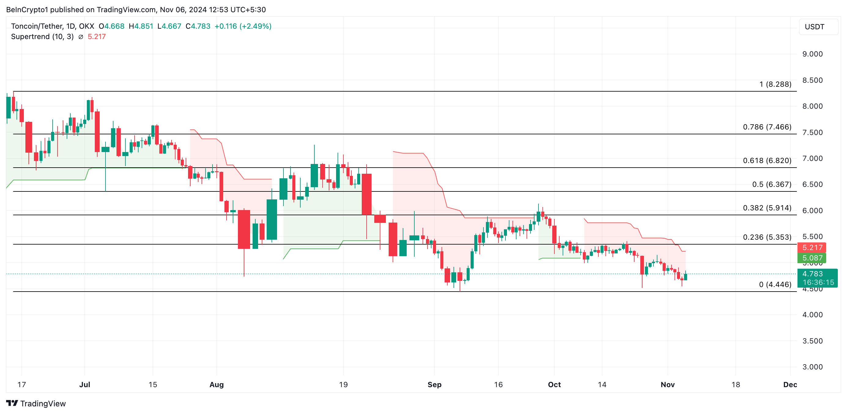Toncoin è attualmente scambiato a 4,78 USD, poco sopra un livello di supporto critico a 4,44 USD. Se il rally del mercato più ampio rallenta e la pressione ribassista aumenta, Toncoin potrebbe ritirarsi verso questa zona di supporto.