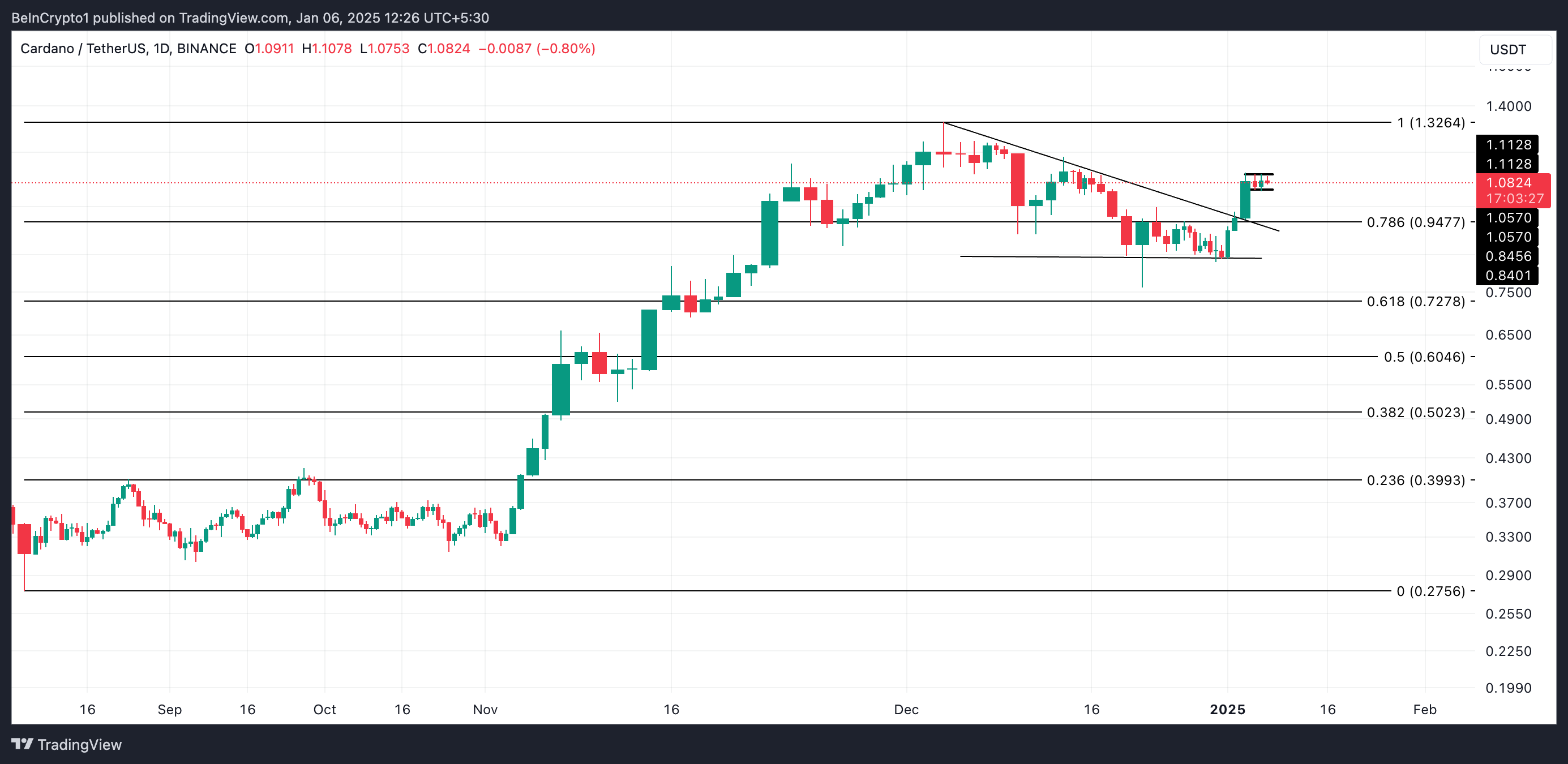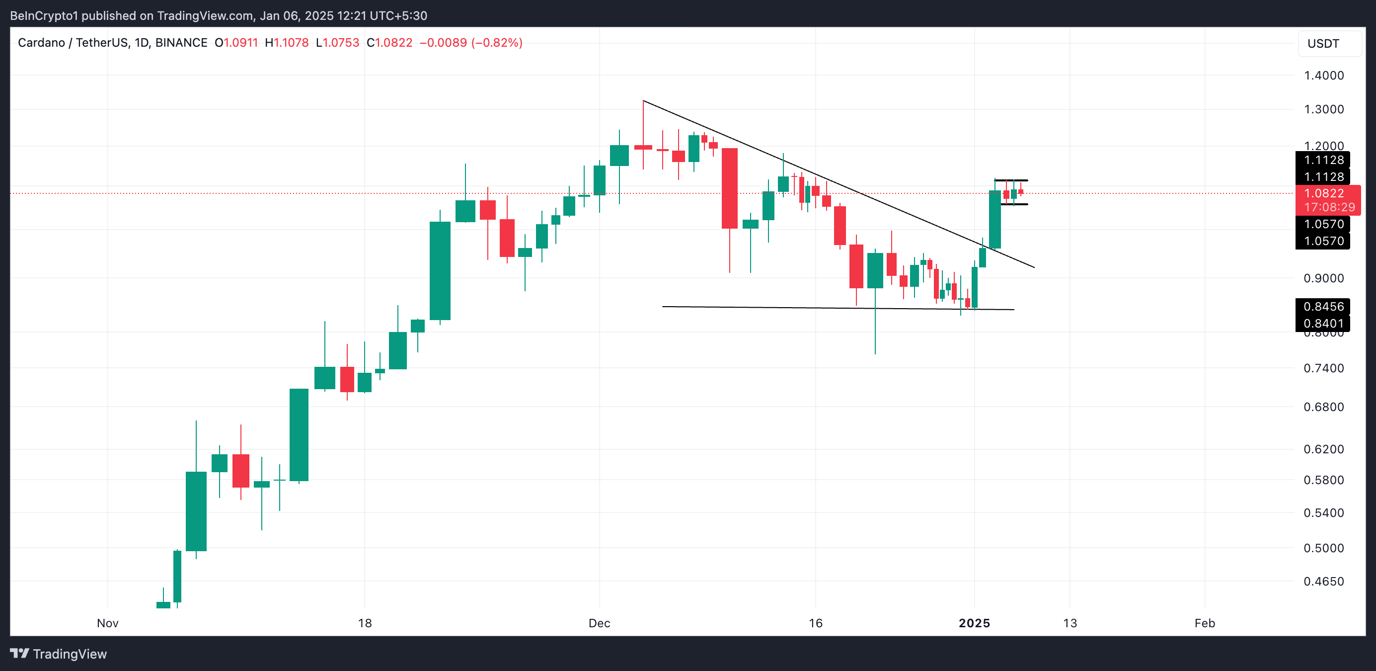 Cardano (ADA) è aumentato del 25% nell’ultima settimana, superando un livello di resistenza chiave — la linea superiore di un pattern a triangolo discendente. Questo breakout rialzista ha inizialmente suscitato ottimismo, con il mercato che puntava a un potenziale ritorno al suo massimo di due anni di 1,32 USD.