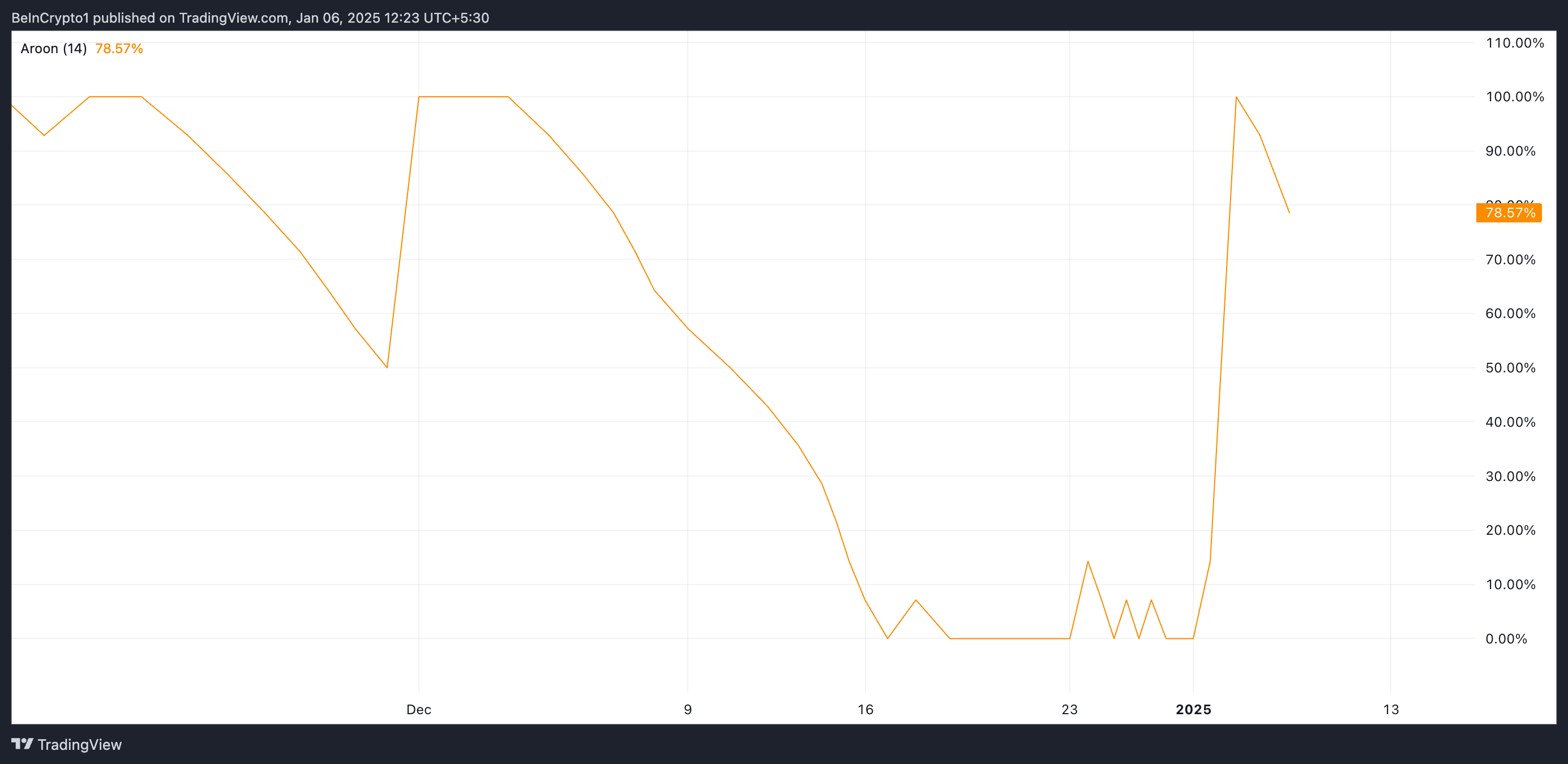L’indicatore Aroon misura la forza e la direzione di un trend analizzando il tempo trascorso dagli ultimi massimi (Aroon Up) e minimi (Aroon Down) di un asset. Quando la linea Aroon Up è in calo, i recenti massimi dell’asset diventano meno frequenti, indicando un indebolimento del momentum rialzista o un potenziale spostamento verso un trend ribassista.