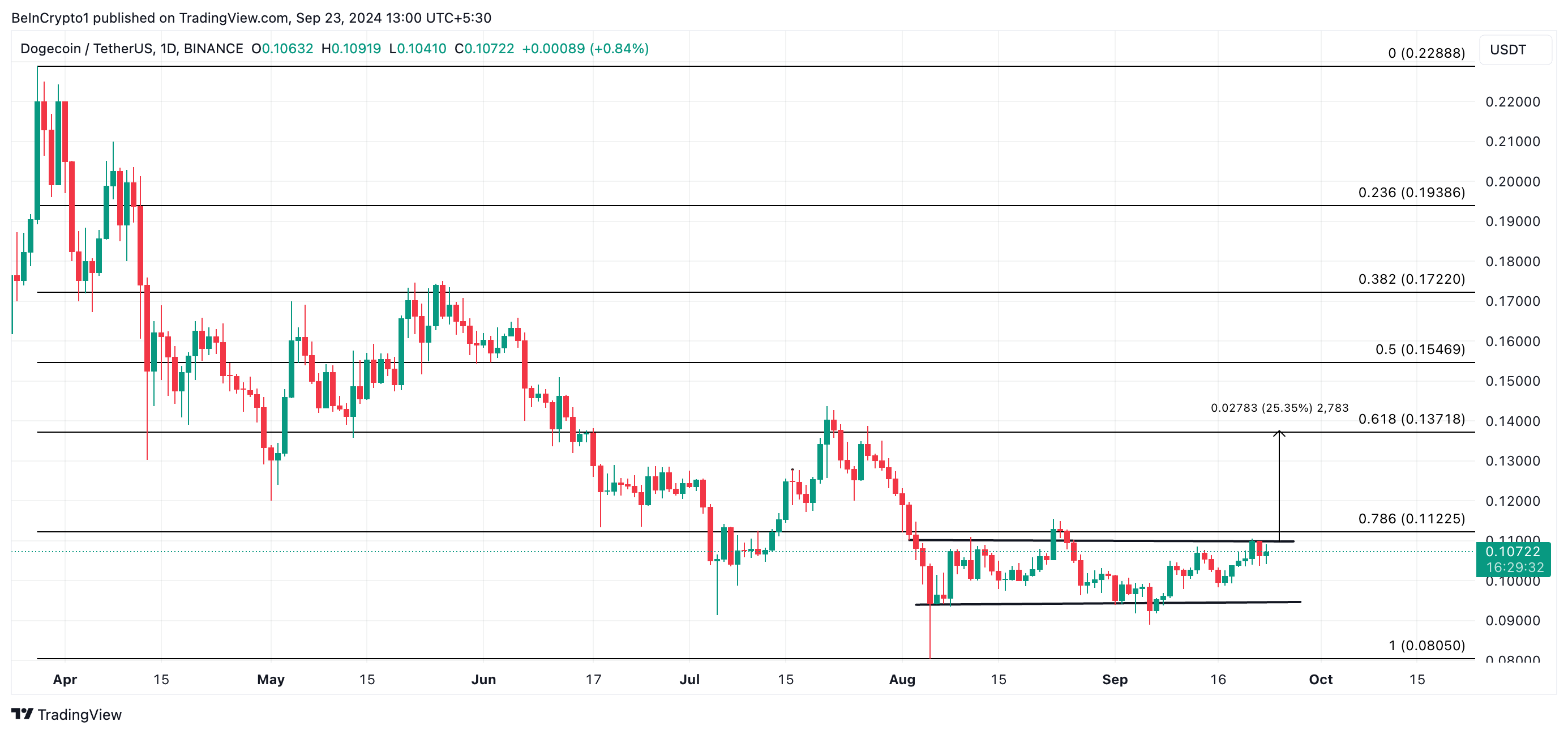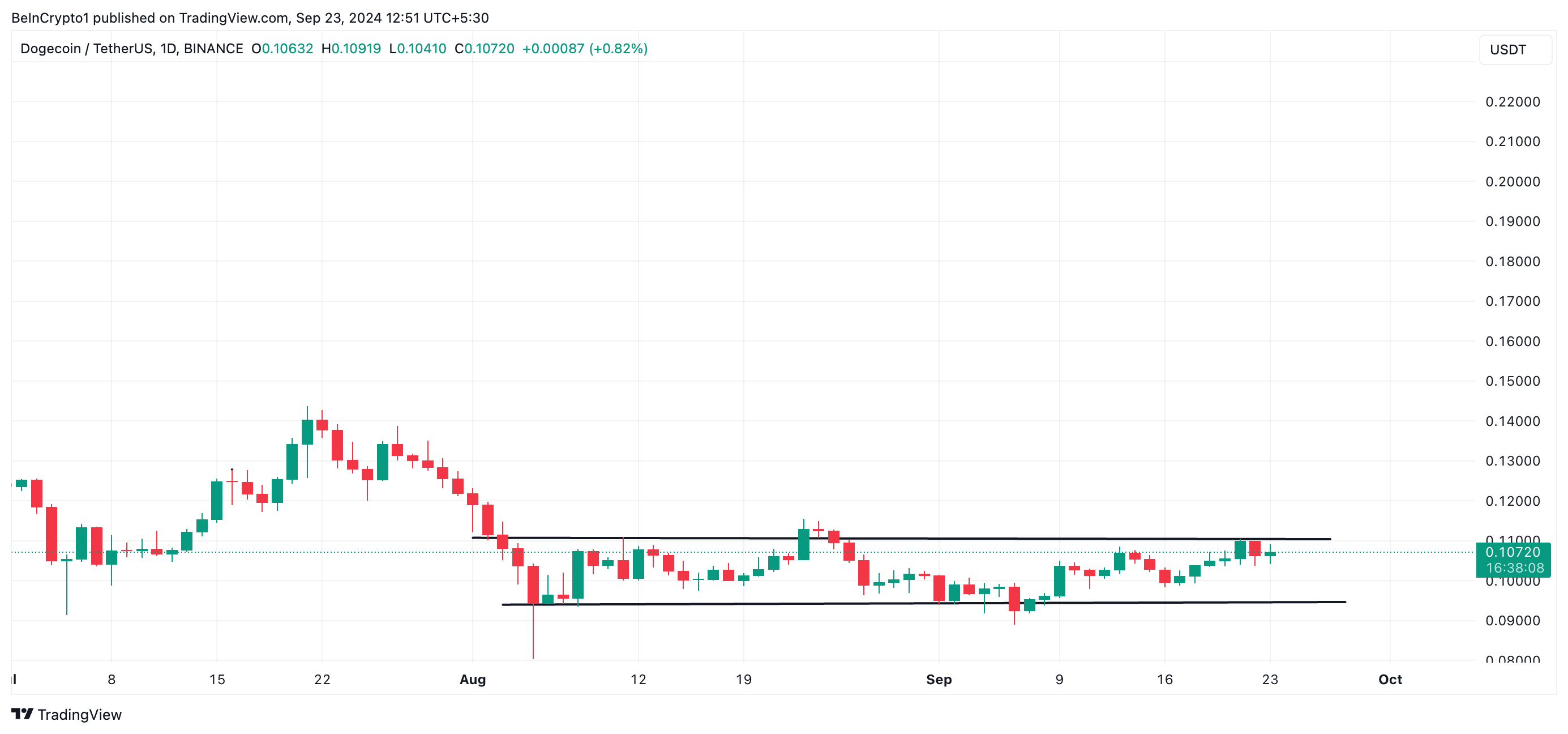 Dogecoin ha scambiato all’interno di un canale orizzontale dal 4 agosto. L’equilibrio tra pressioni di acquisto e vendita ha mantenuto il suo prezzo limitato per oltre 30 giorni.