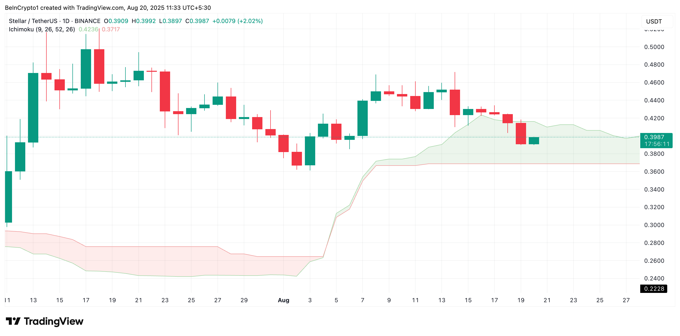 In questo caso, il suo prezzo potrebbe scendere verso $0,3717, dove lo Span B forma ancora un supporto dinamico. Se questo livello non dovesse reggere, il valore di XLM potrebbe scendere a $0,3620.