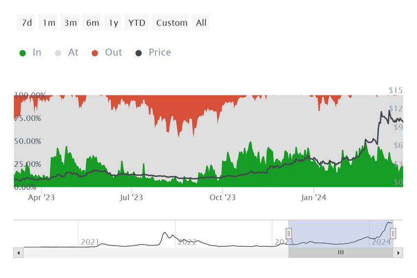 Non solo, ma se si analizzano gli indirizzi attivi, sembra che i detentori di RNDR stiano ancora cercando di trarre profitto. La distribuzione degli indirizzi attivi in base alla redditività mostra che il 77% degli investitori è in attivo, senza profitti o perdite, mentre un altro 21% è in attivo.