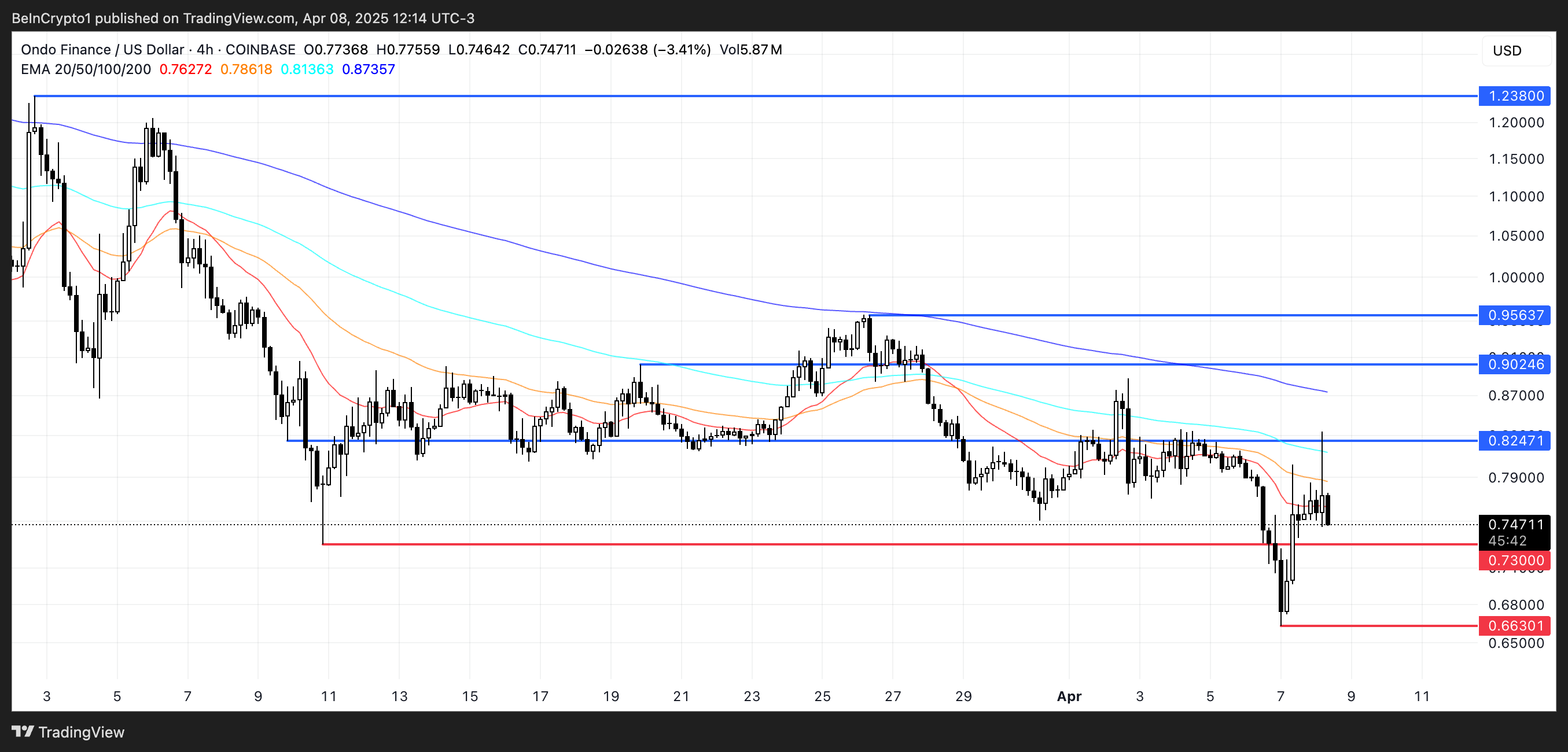 SponsoredSe il trend ribassista persistesse, ONDO potrebbe prima testare il supporto chiave a $0,73. Una rottura al di sotto di quel livello potrebbe innescare ulteriori perdite verso $0,66, e se la pressione di vendita accelerasse, il token potrebbe scendere sotto $0,60 — un livello non visto dall’inizio del 2024.