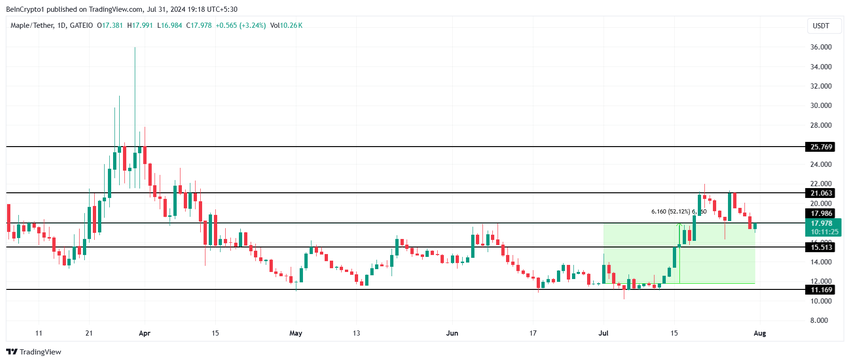 La più grande barriera all’ascesa di MPL è stata 21,06 dollari. L’altcoin non è riuscita a superarla due volte e non è riuscita a chiudere al di sopra di essa da metà aprile. Se ciò accadesse, il prezzo di Maple avrebbe la possibilità di salire a 25,76 dollari e continuare il suo rialzo.
