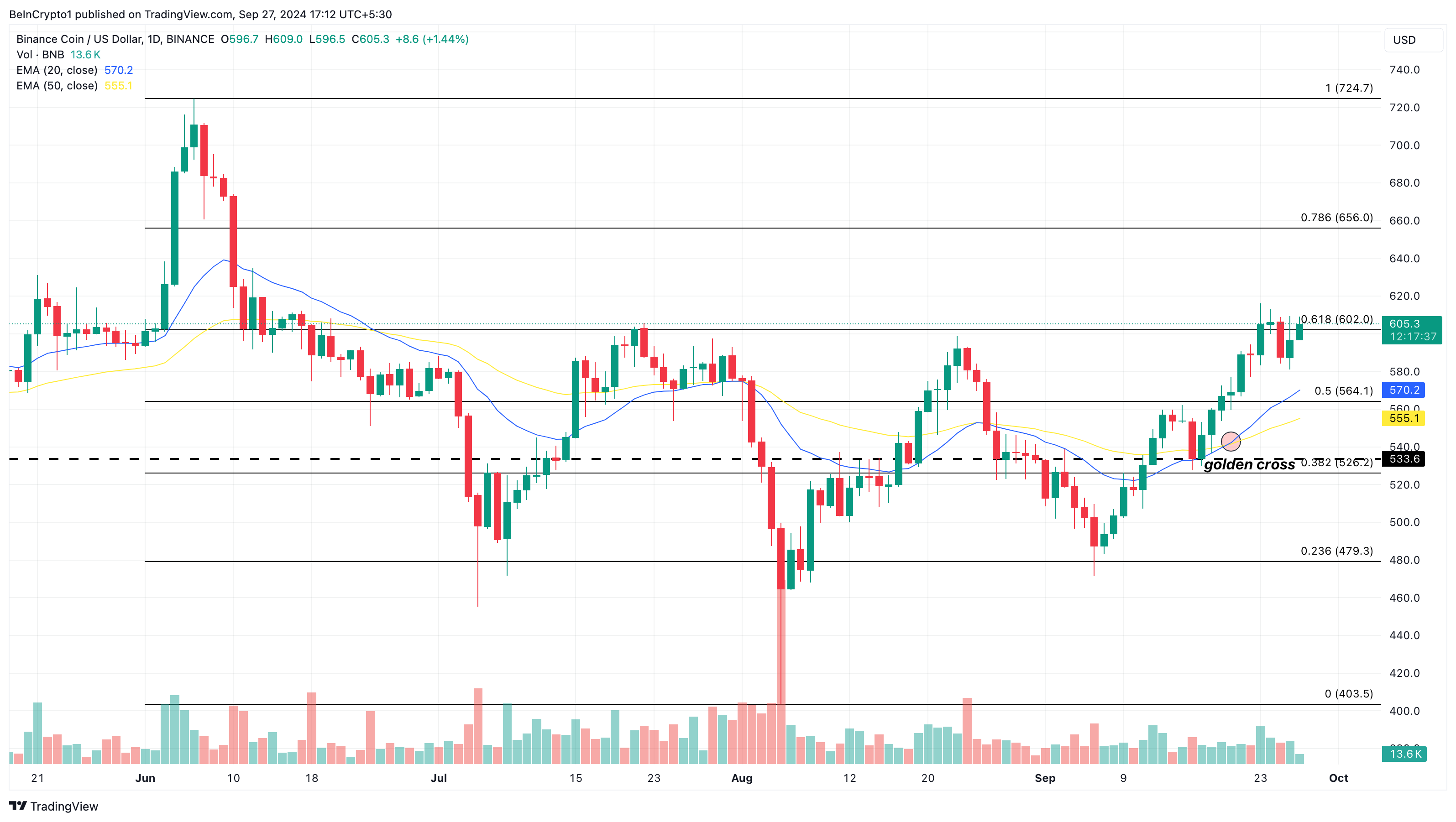Il 6 settembre, il BNB aveva un prezzo di 487,20 USD e, al momento della scrittura, ha superato i 600 USD. Mentre gli investitori prevedono ulteriori guadagni, alcuni analisti suggeriscono che un rally più forte del previsto potrebbe verificarsi prima del previsto, spinto dall’entusiasmo del mercato per il ritorno di CZ.