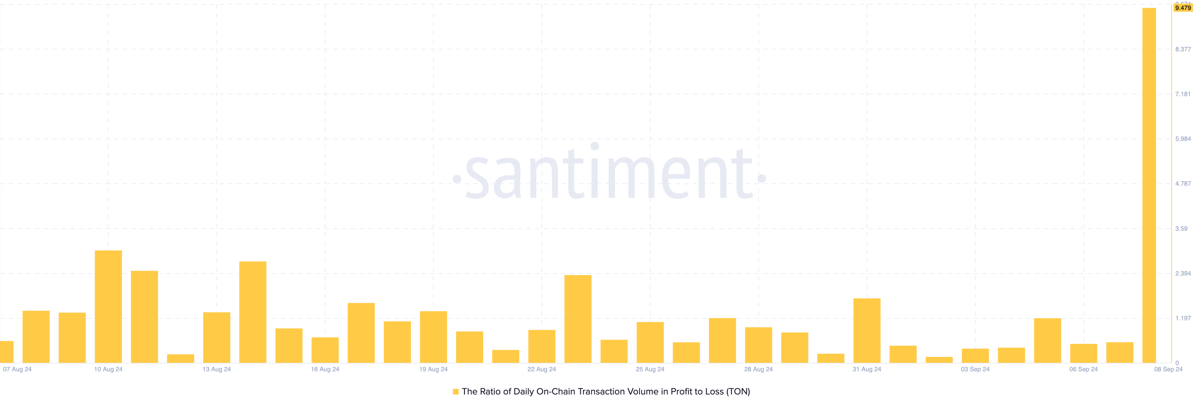 Secondo i dati di Santiment, il rapporto tra il volume delle transazioni on-chain giornaliere in profitto e perdita ha raggiunto il suo livello più alto da febbraio. Questa metrica traccia la quantità aggregata di token che si sono mossi in profitto o perdita.