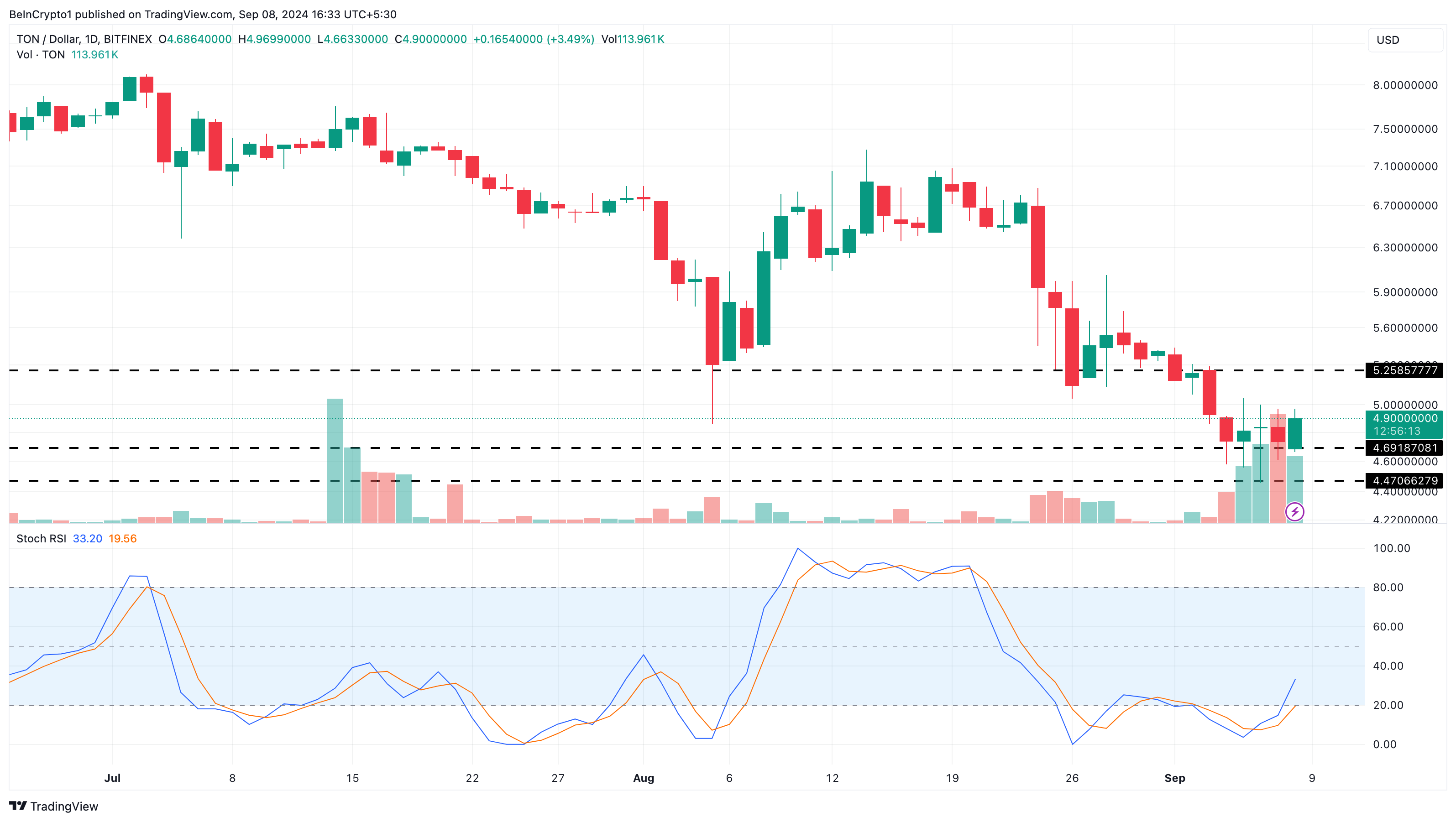 Il prezzo di Toncoin è recentemente rimbalzato da 4,61 USD. Ora scambiato a 4,90 USD, l’altcoin mira a superare i 5 USD. Tuttavia, l’indice di forza relativa stocastica (RSI) rivela che il tentativo potrebbe non essere fruttuoso.
