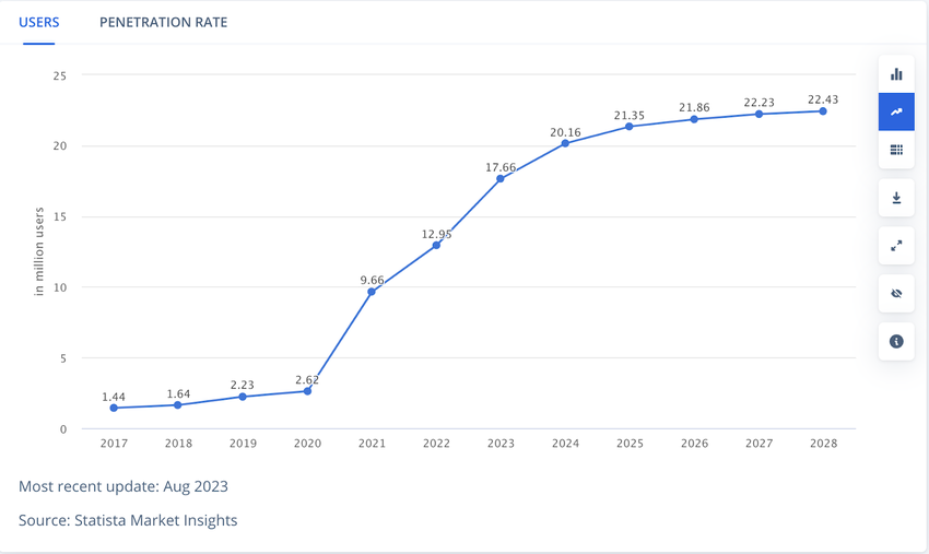 La schermata sottostante mostra che nel 2023 ci saranno 17,66 milioni di utenti di criptovalute nel Regno Unito. Si prevede che il numero di utenti aumenterà a 22,43 milioni entro il 2028.