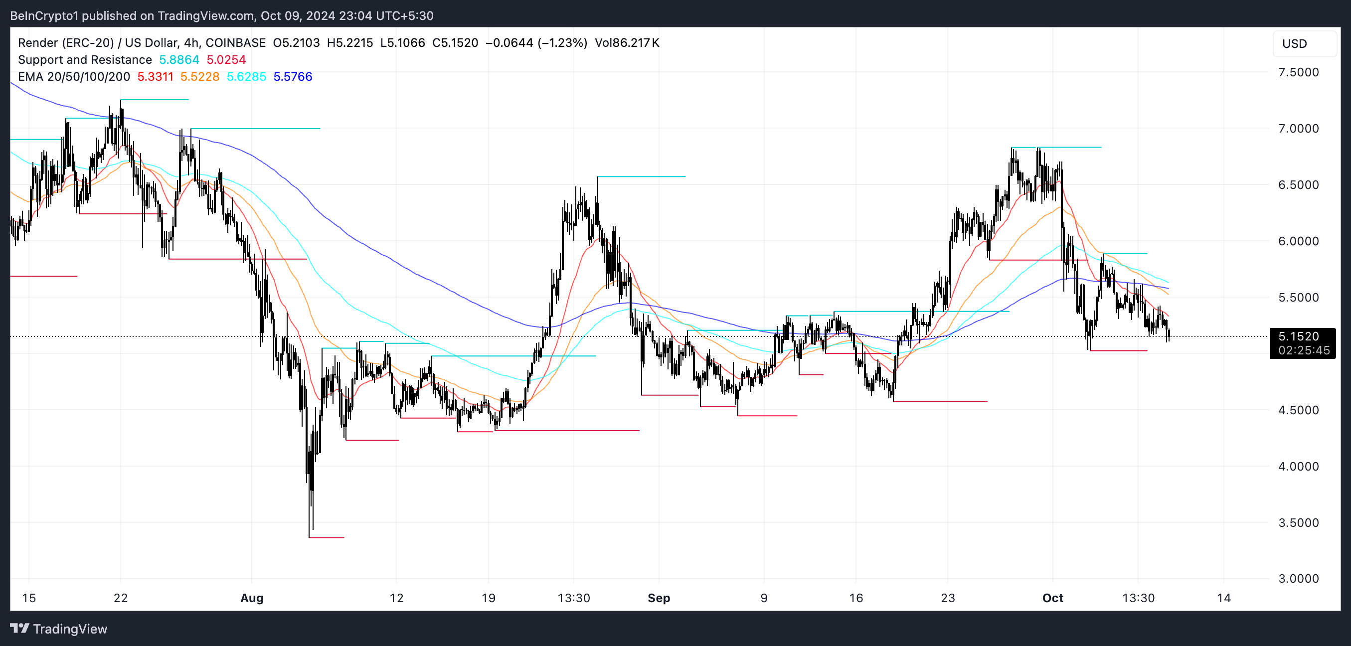 Il 2 ottobre, le linee EMA di RNDR hanno formato una death cross, che si verifica quando l’EMA a breve termine incrocia sotto l’EMA a lungo termine, segnalando una potenziale tendenza al ribasso.