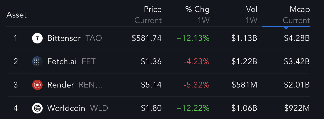 Questo divario di performance mostra che RNDR non sta capitalizzando la tendenza rialzista più ampia osservata nel mercato delle cripto IA. Inoltre, il volume di trading settimanale di RNDR è molto inferiore rispetto ai suoi concorrenti, essendo il 45% più basso di WLD, che si classifica terzo per volume.