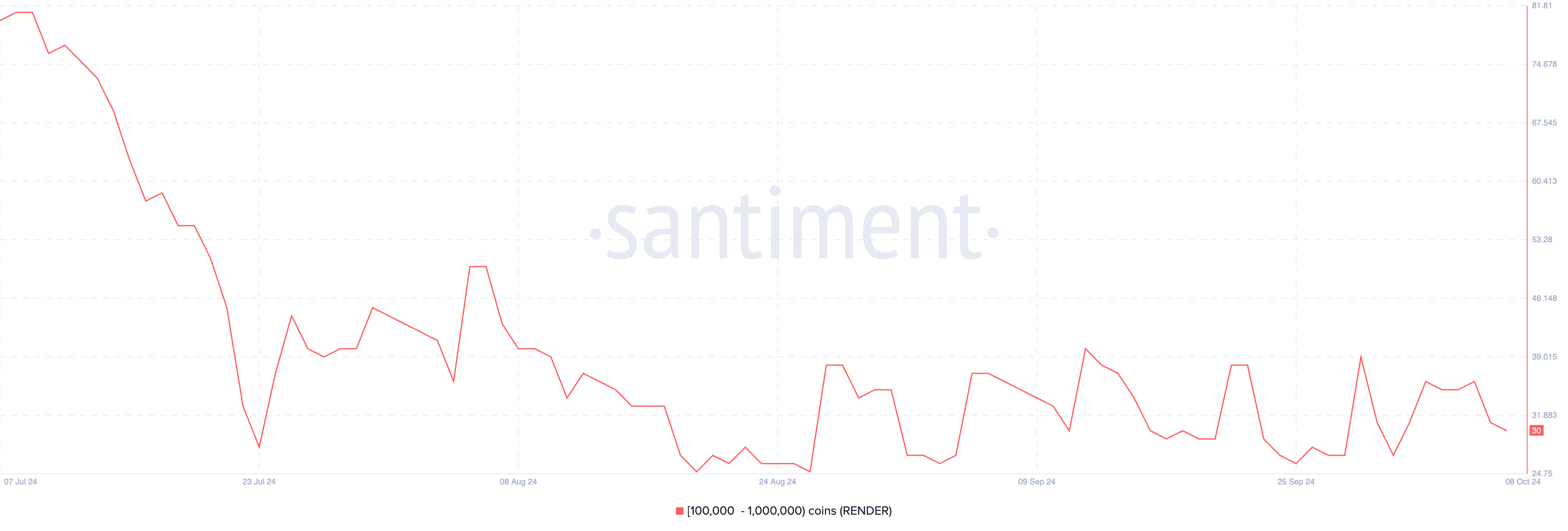 RNDR sta attualmente affrontando sfide significative nell’attrarre e mantenere grandi detentori, che sono cruciali per il successo a lungo termine di un progetto. Da luglio 2024, il numero di utenti che detengono tra 100 000 e 1 000 000 di token RNDR è sceso da 80 a soli 30 e dal 8 agosto questo numero è rimasto a 40 o meno.