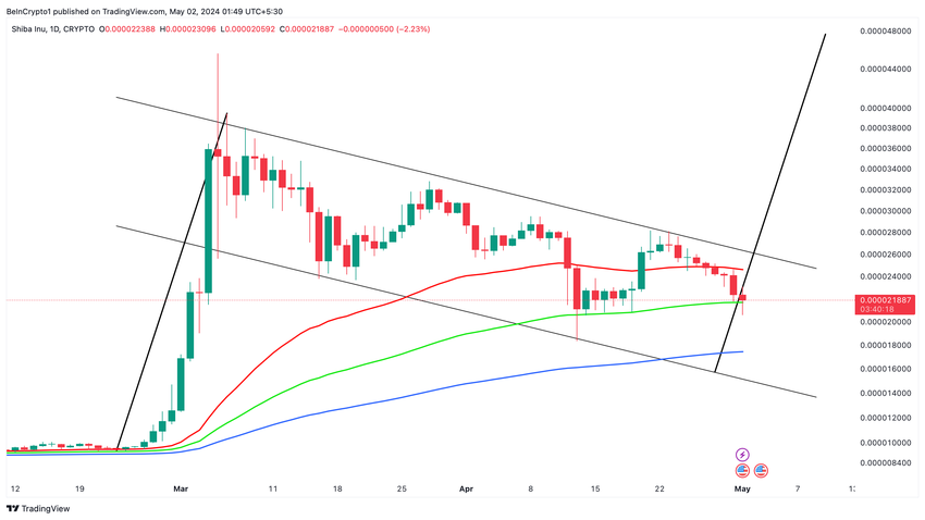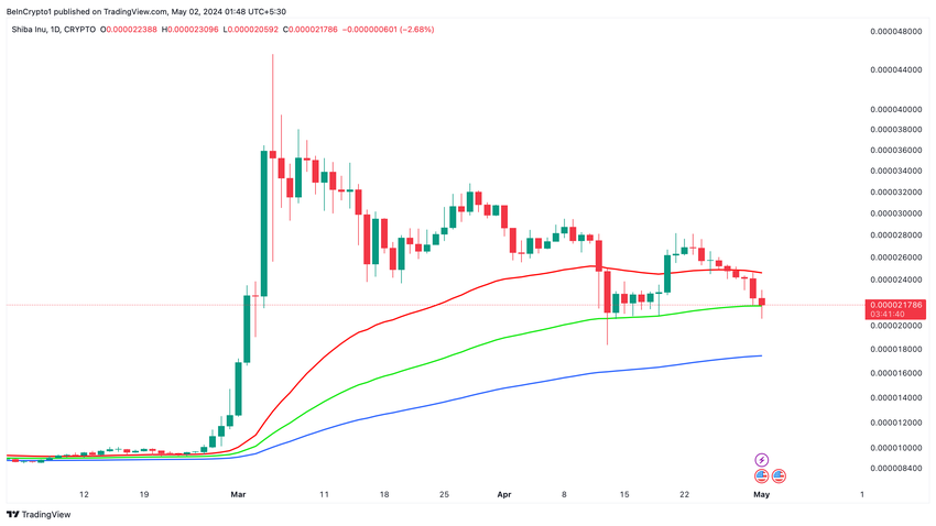 Shiba Inu (SHIB) è attualmente in bilico su un bordo precario. Un livello tecnico cruciale supporta la meme coin che si aggira intorno a 0,000021$, la media mobile esponenziale (EMA) a 100 giorni.