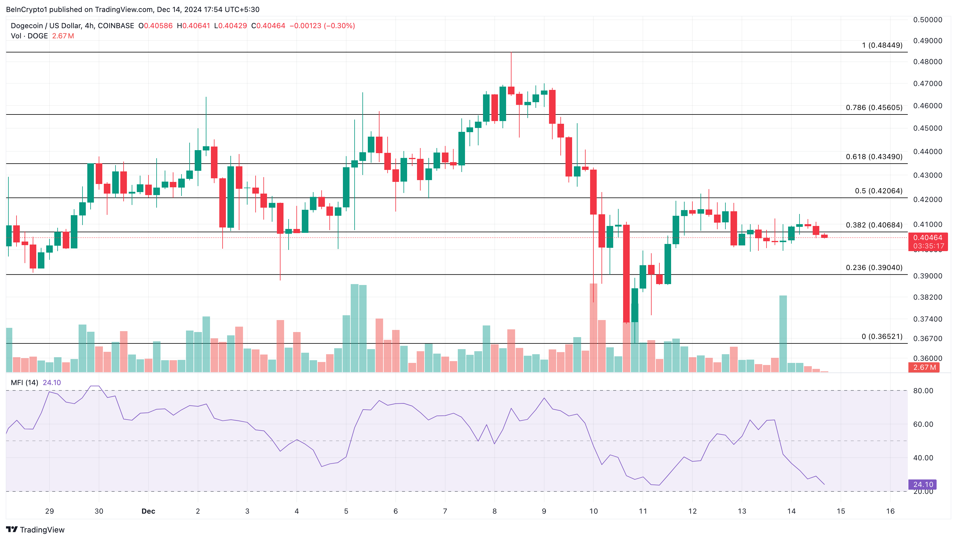 Secondo il grafico a 4 ore, il calo del valore di DOGE potrebbe essere collegato a un aumento della distribuzione. In particolare, l’Indice di Flusso di Denaro (MFI), che esamina il livello di pressione di acquisto e vendita nel mercato, è sceso da 75.57 a 24.12.