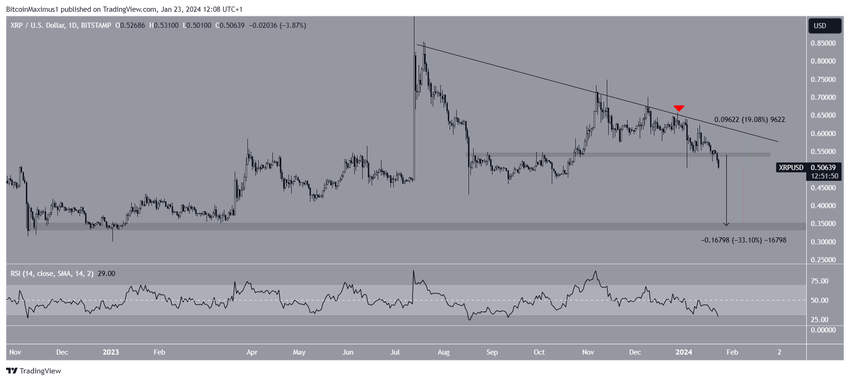 Una rottura che percorra l’intera altezza del pattern (freccia nera) porterà XRP al supporto più vicino a 0,34 dollari, un calo del 33% rispetto al prezzo attuale.