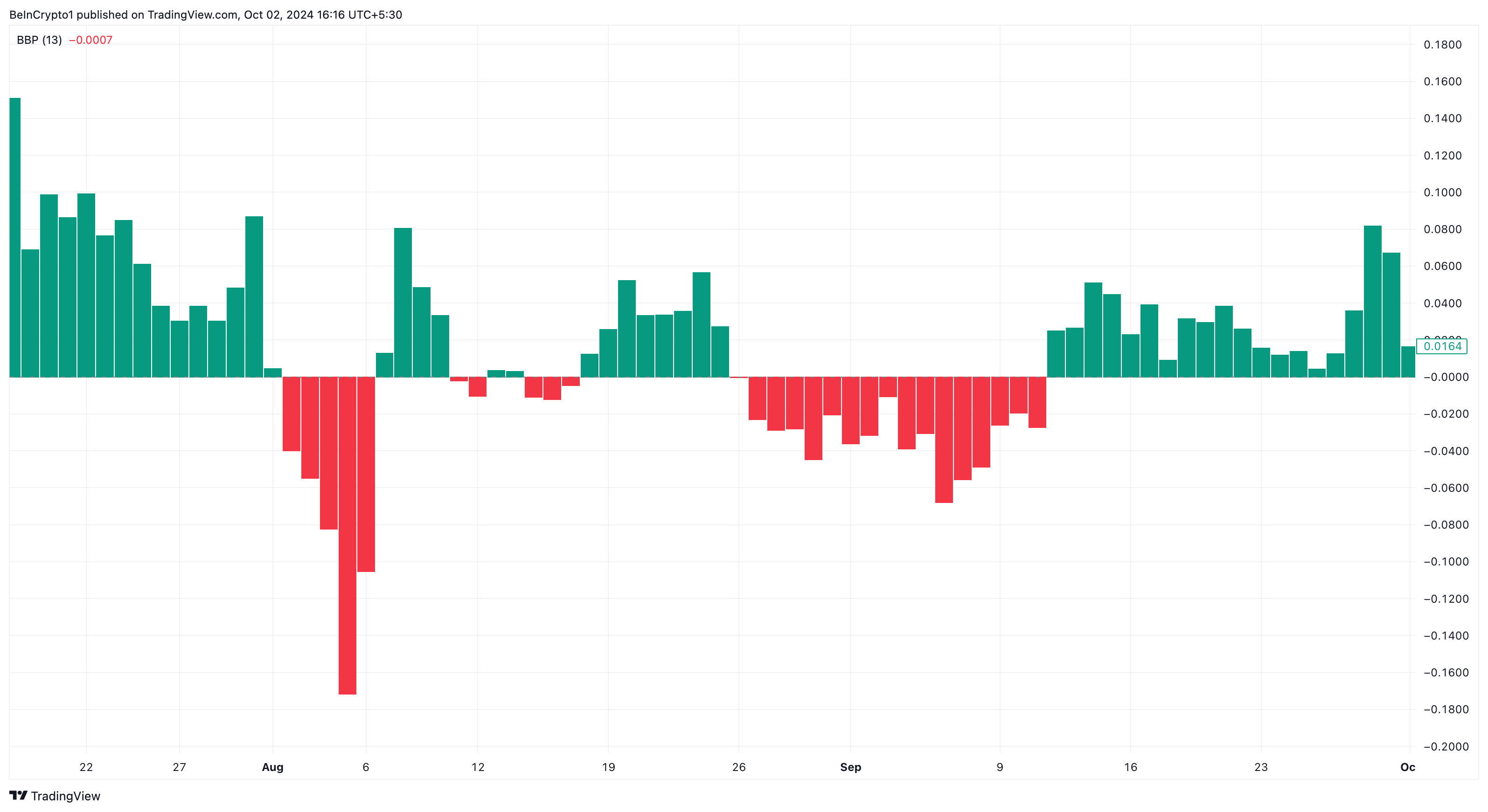 Secondo il grafico giornaliero, il Bull Bear Power (BBP) di XRP è positivo. Il BBP confronta i prezzi più alti e più bassi di un asset con la sua media mobile esponenziale (EMA). Con questo, l’indicatore tecnico può indicare la forza di compratori e venditori.