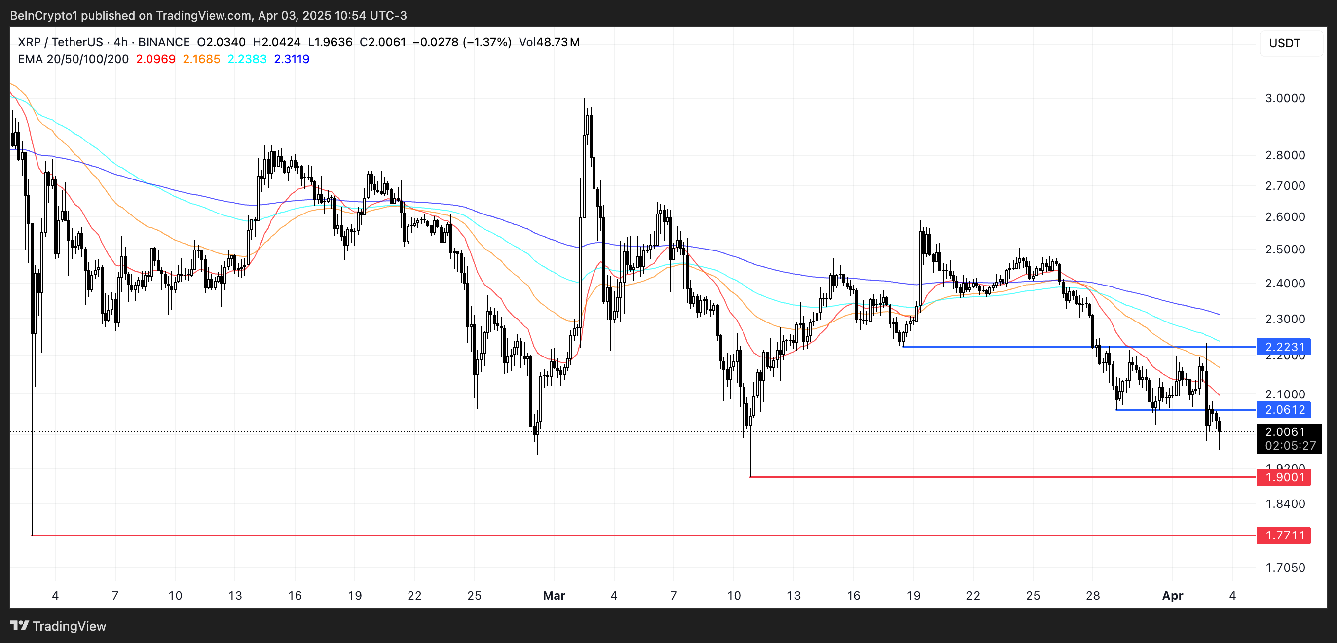 A meno che i rialzisti non intervengano presto, le previsioni di prezzo di XRP indicano che potrebbe essere sulla buona strada per testare il supporto intorno a $1,90, un livello chiave che ha tenuto in passato.