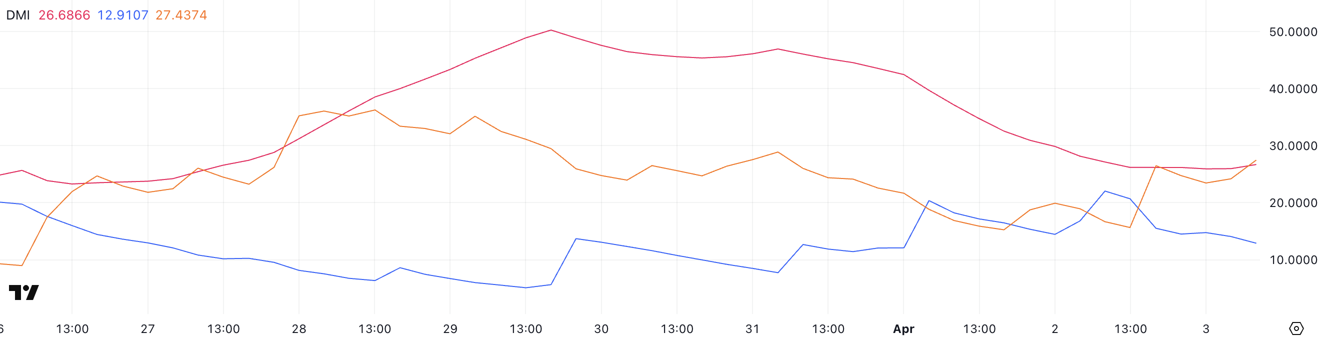 Nel frattempo, il +DI è sceso a 12,91, in calo rispetto a 22 di ieri—indicando un calo del momentum rialzista. Allo stesso tempo, il -DI è salito a 27,43 da 15,64, indicando una crescente pressione ribassista.