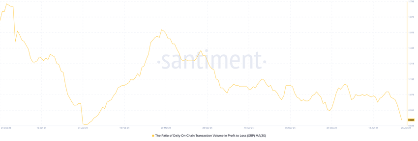 Il calo costante del valore di XRP è in parte attribuibile alle perdite che i suoi possessori hanno subito di recente. Ad esempio, il rapporto tra il volume giornaliero delle transazioni in profitto e quello in perdita (valutato utilizzando una media mobile a 30 giorni) è pari a 0,88 al momento della stampa.