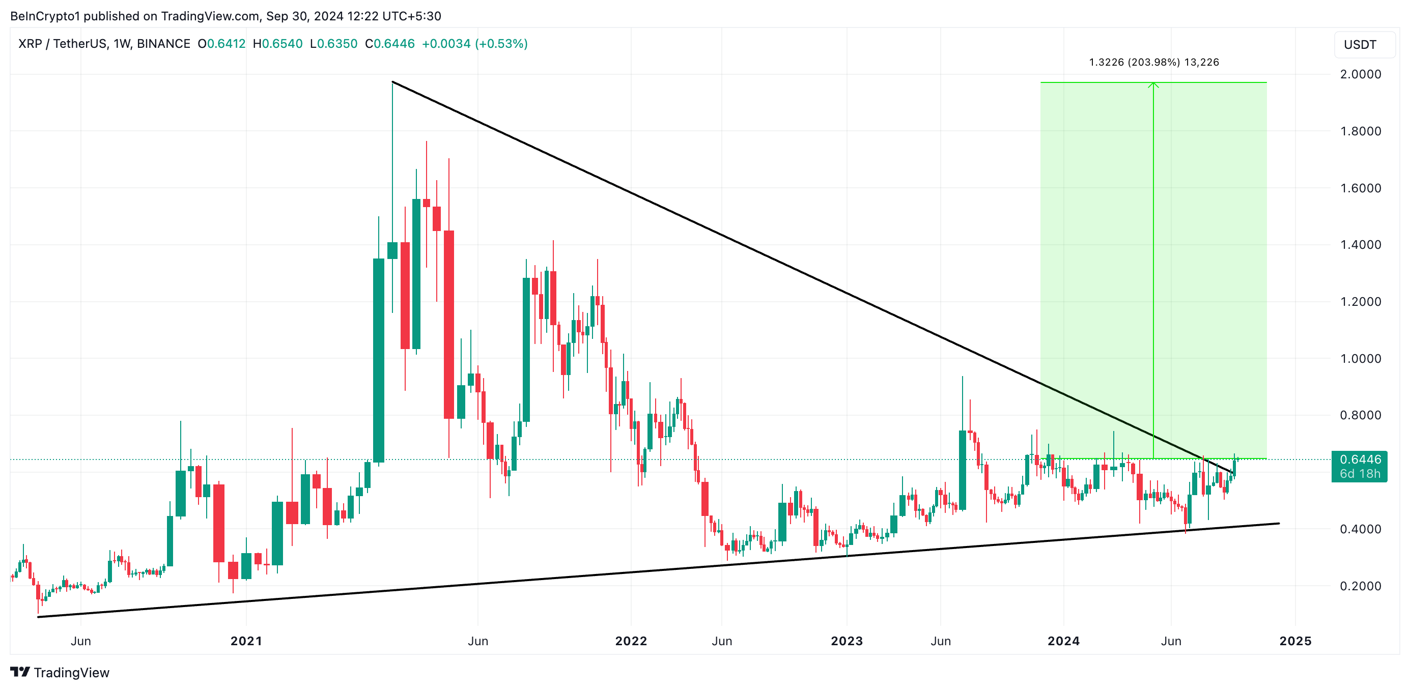 Se questa tendenza continua, il prezzo di XRP potrebbe aumentare del 203% e scambiare a 2 USD per la prima volta dai primi giorni della pandemia di COVID-19 nel 2020.