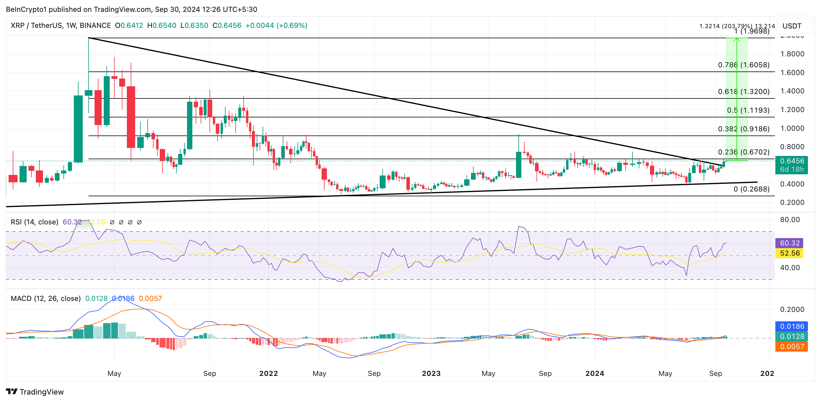 L’incremento graduale del prezzo di XRP nell’ultimo mese ha infine causato un rally sopra la linea superiore di questo triangolo il 23 settembre. La rottura sopra questa resistenza indica che i tori di XRP hanno sopraffatto le forze ribassiste, confermando il potenziale per ulteriori guadagni di prezzo.
