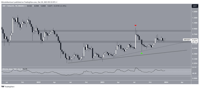L’analisi tecnica su base settimanale mostra che XRP ha seguito una linea di supporto ascendente dal maggio 2022.