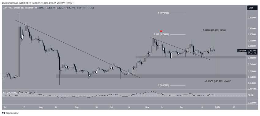 L’azione del prezzo di XRP mostra che dopo essere uscito da una linea di tendenza di resistenza discendente, il prezzo di XRP è stato respinto dal livello di resistenza di ritracciamento 0,618 Fib (icona rossa) a 0,75 dollari.