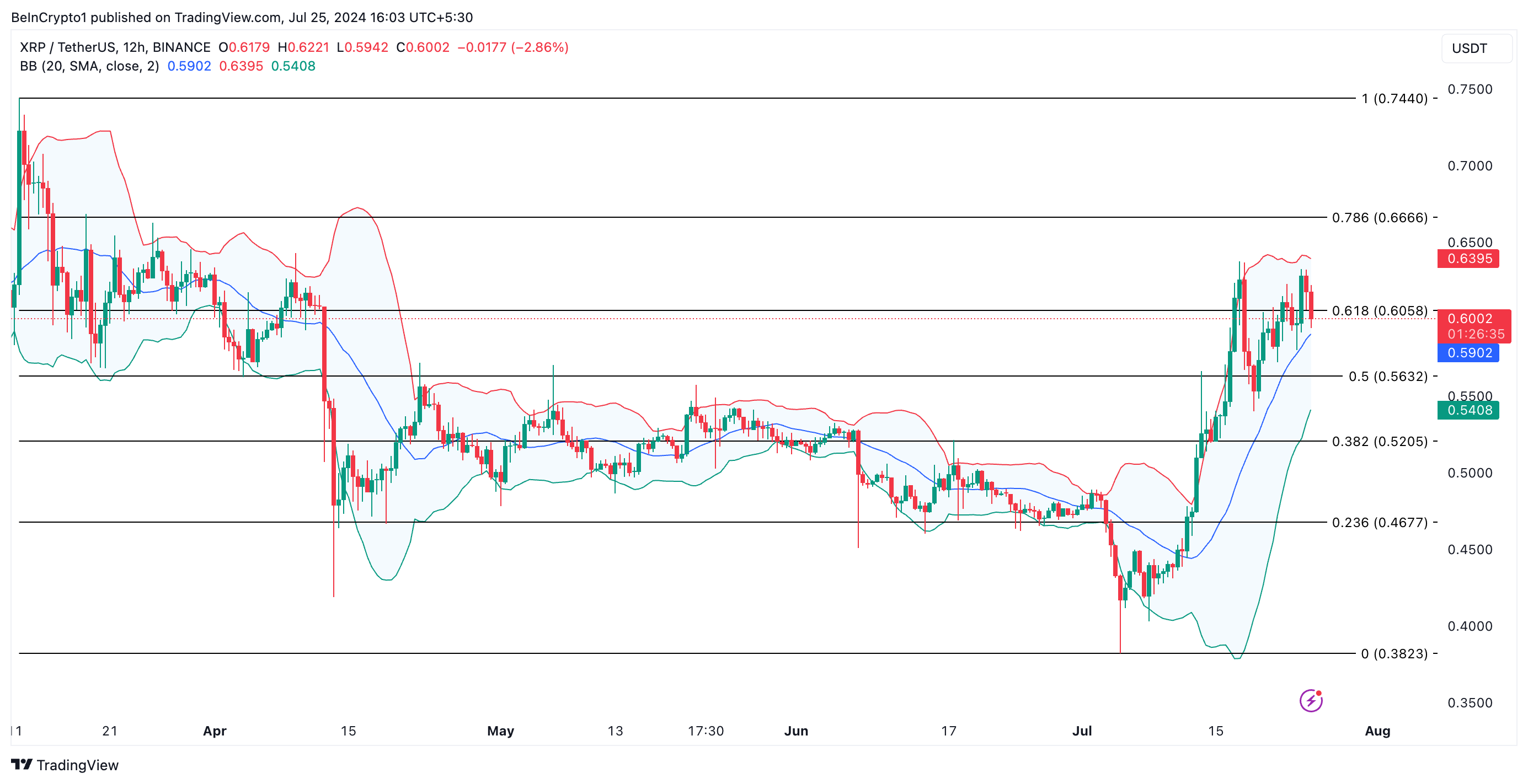 Il crescente divario tra le bande superiori e inferiori dell’indicatore Bollinger Bands (BB) di XRP conferma questa volatilità. Il token rischia di oscillare in entrambe le direzioni.