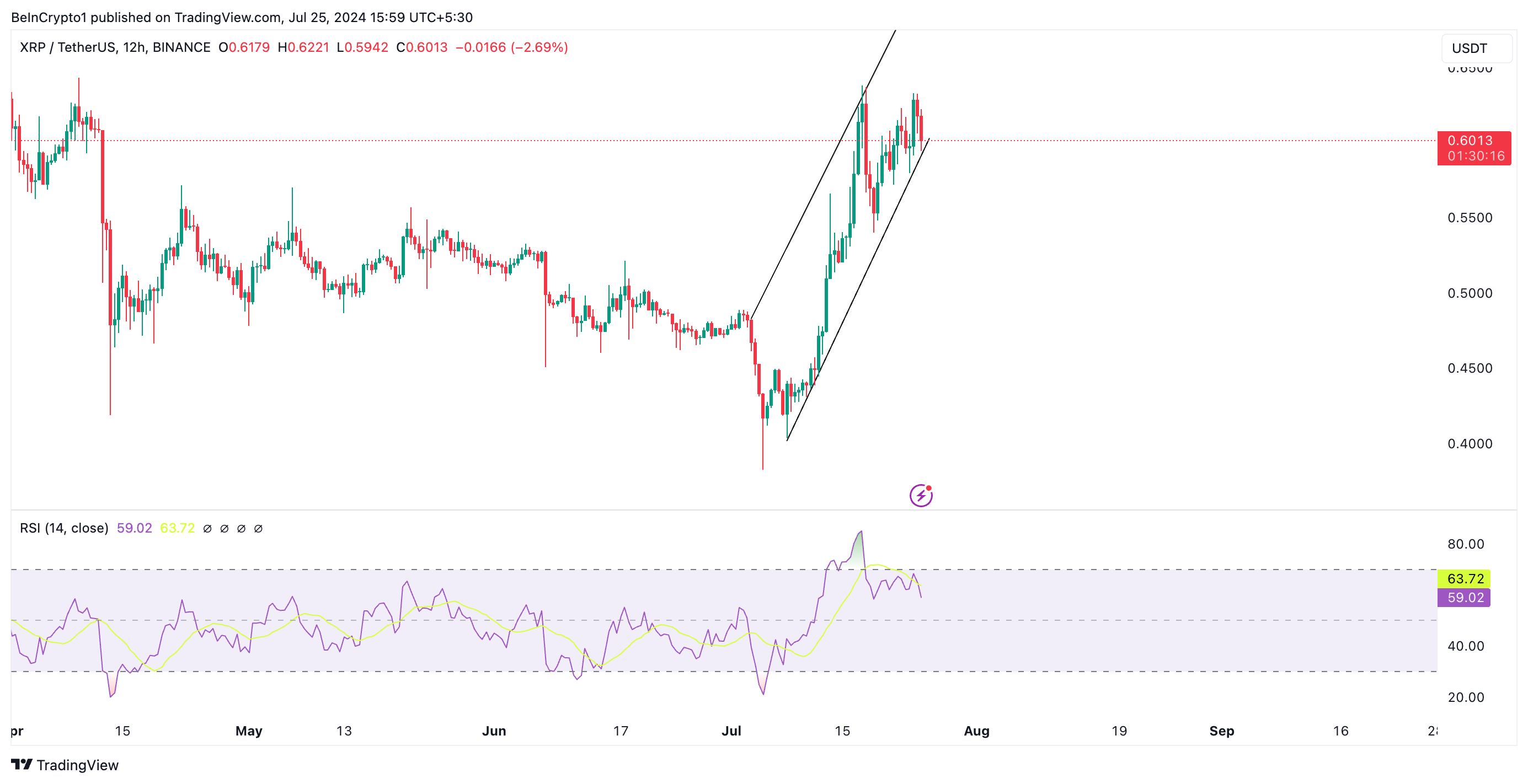 XRP scambia attualmente a 0,60 dollari. In previsione dell’imminente incontro di Ripple con le autorità di regolamentazione, il prezzo del token ha subito un’impennata ed è in tendenza all’interno di un canale ascendente.