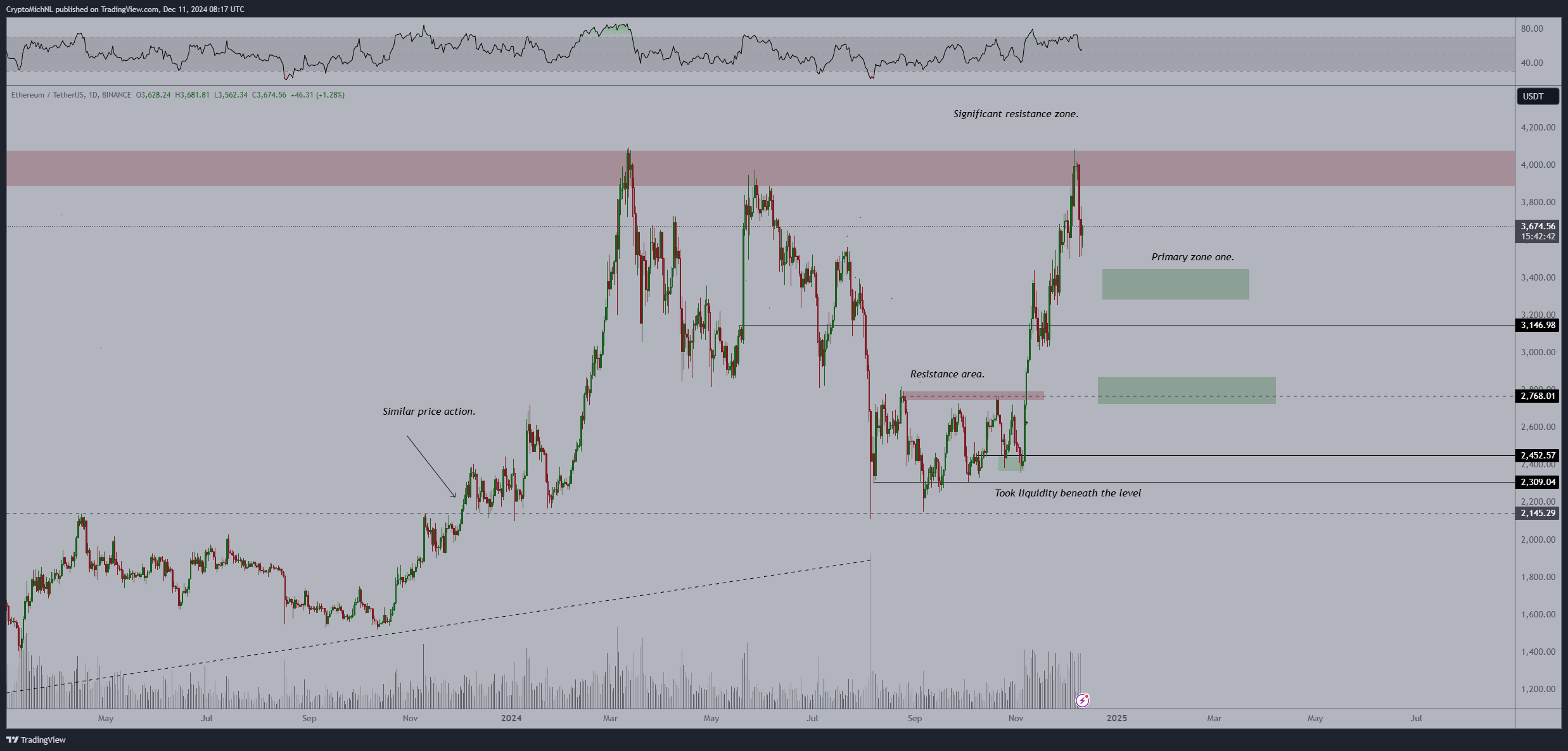 Tuttavia, ha menzionato che il prezzo di ETH sta testando un’area di resistenza cruciale che potrebbe convalidare l’aumento. Un’occhiata al grafico condiviso da van de Poppe mostra che la zona di resistenza è tra 3.800 USD. Quindi, se la crypto supera questa zona, il bull run di Ethereum potrebbe continuare da dove si è fermato più tardi questo mese fino al 2025.