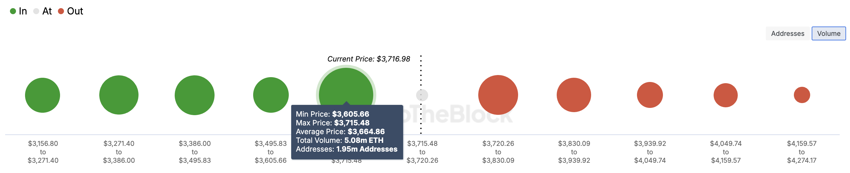 Interessante, il sentimento di van de Poppe sembra allinearsi con le indicazioni mostrate dall’In/Out of Money Around Price (IOMAP). L’IOMAP classifica gli indirizzi in base a chi ha accumulato a un valore inferiore rispetto al prezzo attuale e chi lo ha fatto a un valore superiore.