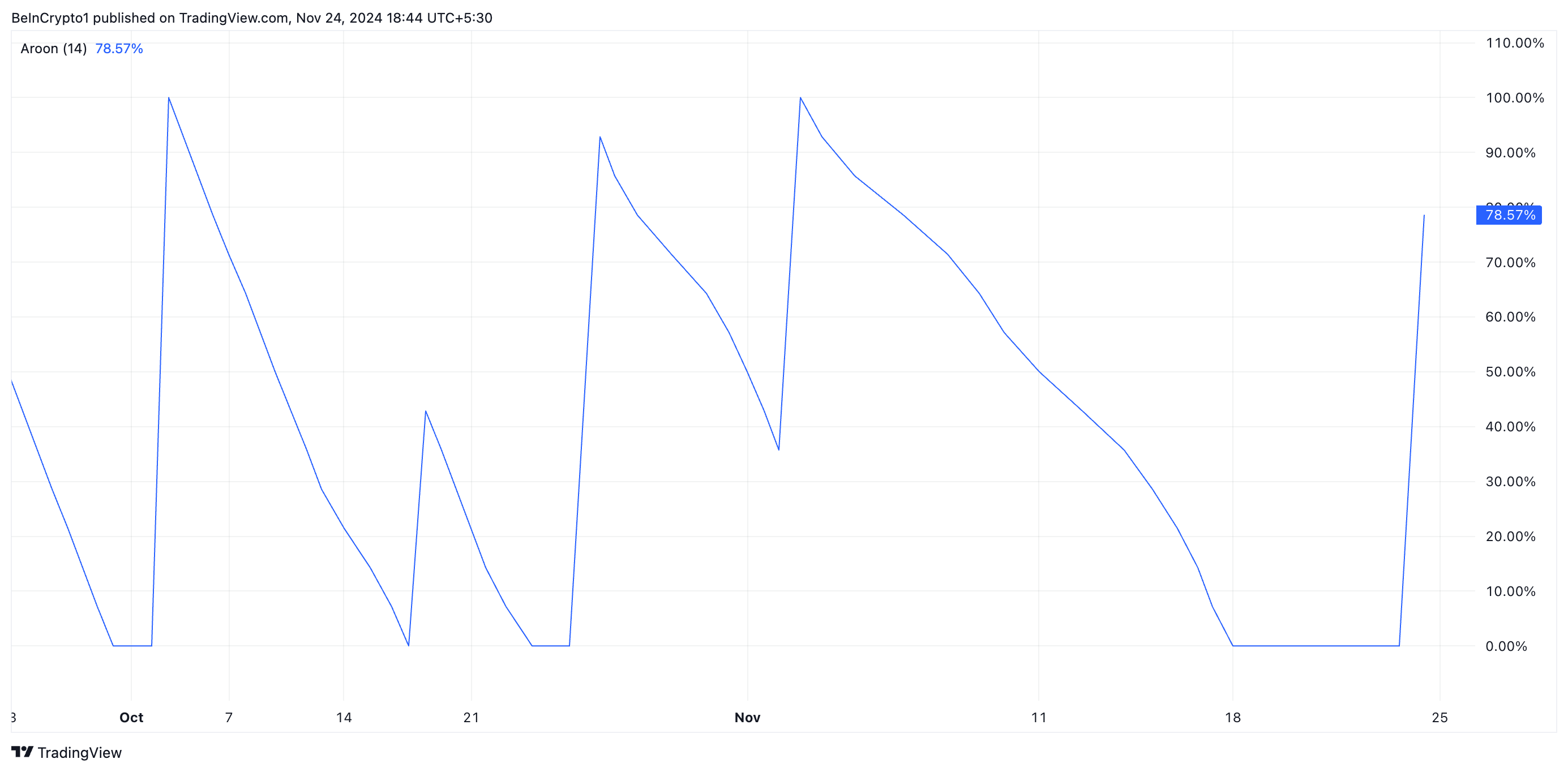 La crescente Aroon Down Line di ETH conferma questa pressione ribassista in rafforzamento. Attualmente si trova al 78,57%, confermando che il calo del prezzo di ETH sta guadagnando slancio.