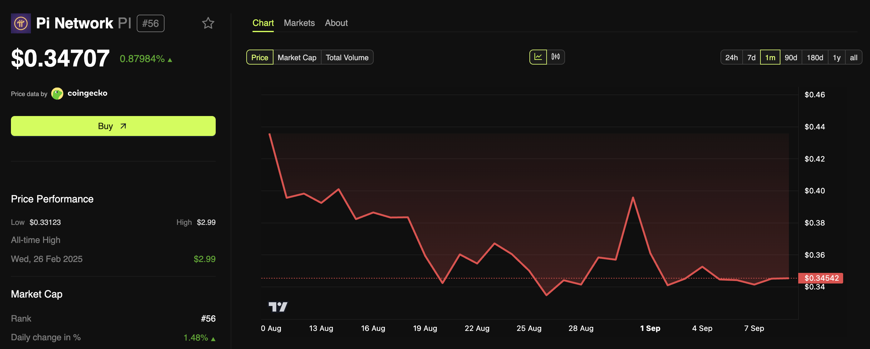 Nonostante questi sforzi, il prezzo di Pi Coin ha subito un calo. I dati di BeInCrypto Markets hanno mostrato che l’altcoin estratto tramite mobile è sceso a un minimo storico (ATL) di $0,33 il 26 agosto, ma è rimbalzato leggermente dopo l’annuncio dell’aggiornamento.
