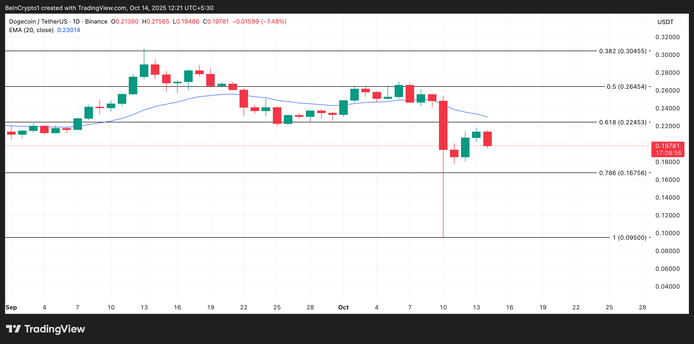 Nel grafico giornaliero, DOGE continua a subire pressioni al ribasso, scambiando al di sotto della sua media mobile esponenziale (EMA) a 20 giorni. L’EMA a 20 giorni attualmente forma una resistenza dinamica a $0,249, mentre DOGE viene scambiato intorno a $0,199 al momento della scrittura.