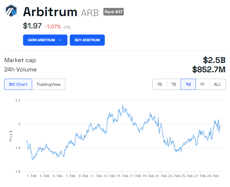 Il token ARB di Arbitrum ha registrato un significativo aumento di valore, salendo di oltre l’11% subito dopo l’annuncio. Al momento della pubblicazione, il prezzo di ARB è di 1,97 dollari.