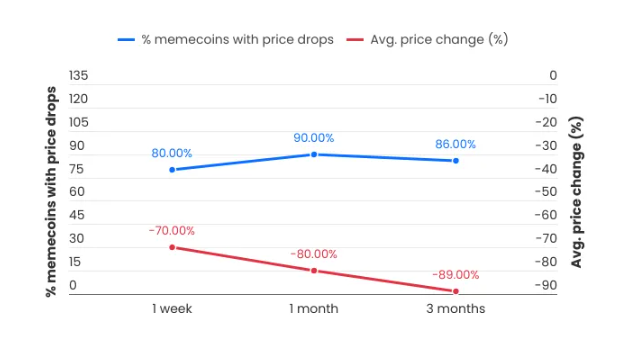 La ricerca ha anche indicato che il 97% delle memecoin fallisce, con solo 15 su 1,7 milioni che sopravvivono. Questo evidenzia la natura precaria di questi asset speculativi. Nello stesso tono, la ricerca ha rivelato che il 76% delle memecoin promosse da influencer perde oltre il 90% del loro valore entro tre mesi, lasciando gli investitori in perdita.