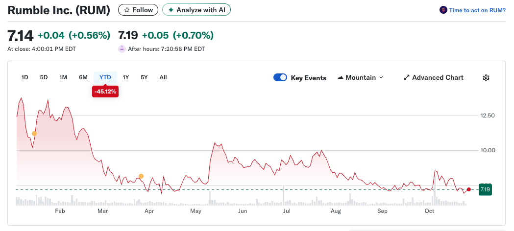 Le azioni di Rumble (RUM) hanno chiuso a $7,14, in aumento dello 0,56% venerdì, sebbene ancora in calo del 45% dall’inizio dell’anno.