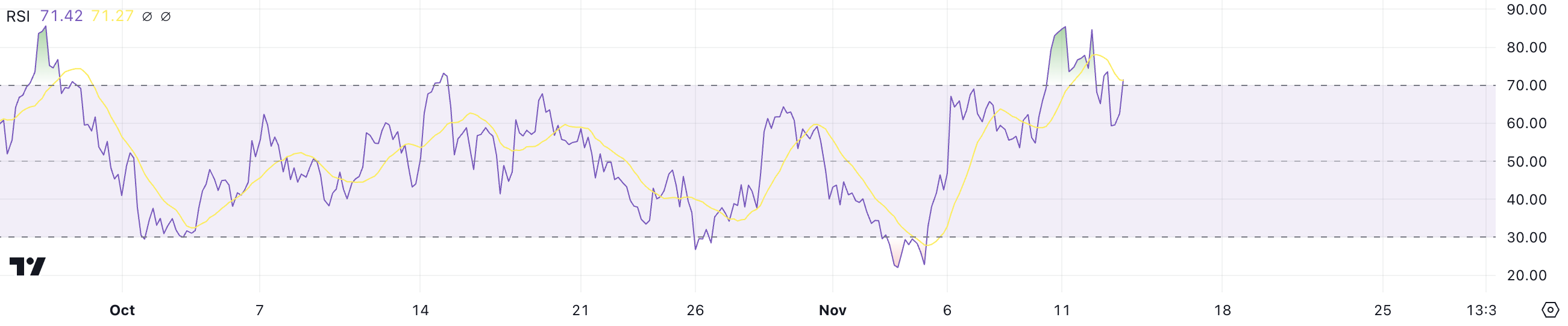 Il recente aumento del prezzo di FLOKI ha portato il suo RSI a 71,42, rispetto a 60 solo un giorno fa, indicando un forte slancio di acquisto. Un RSI sopra 70 suggerisce solitamente che un asset è sovracomprato, indicando una possibile correzione.