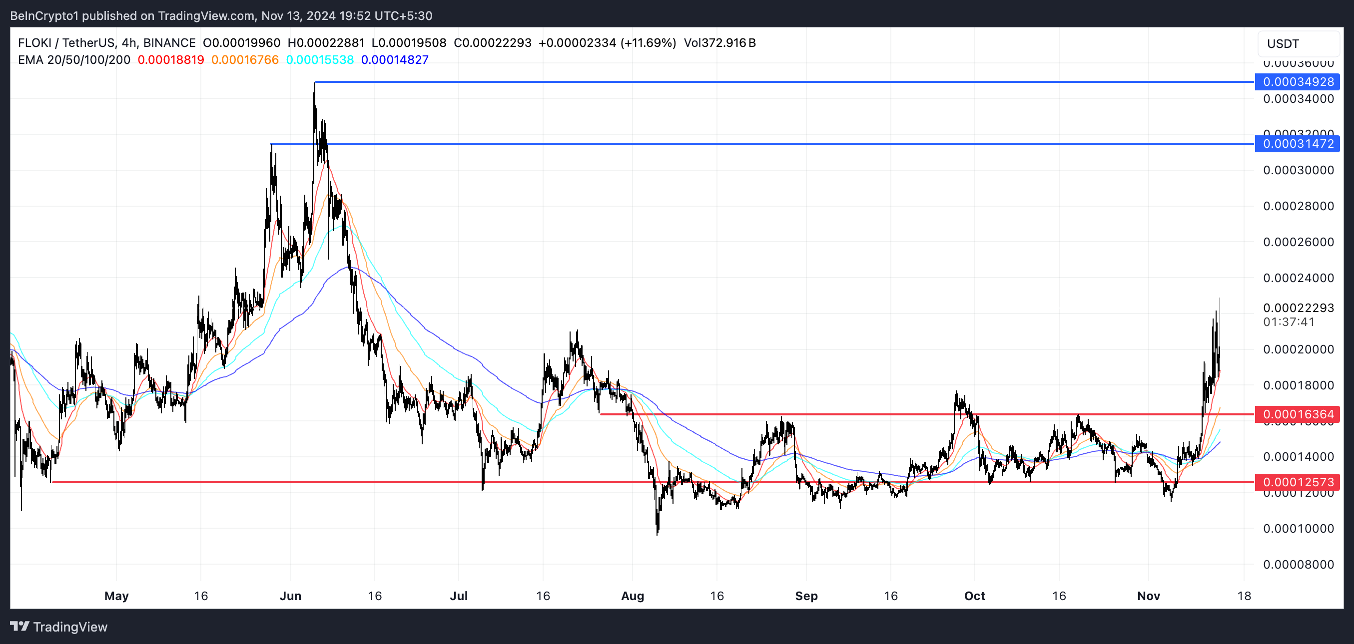 Questo indica un forte slancio ascendente. Se il rally continua, il prezzo di FLOKI potrebbe potenzialmente raggiungere 0,00031 USD, con ulteriore resistenza a 0,000349 USD, rappresentando un possibile aumento del prezzo del 57% dai livelli attuali.