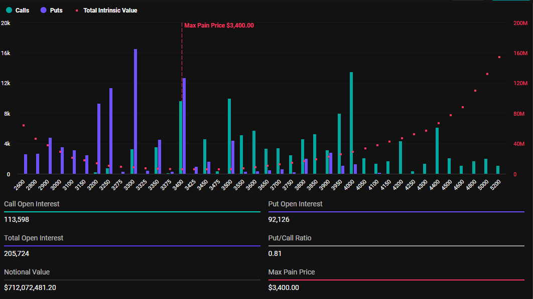 In confronto, i contratti su Ethereum in scadenza oggi hanno un prezzo di massimo dolore di 3.400 USD e un rapporto put-to-call di 0.81, riflettendo una simile prospettiva di mercato. Quando il rapporto put-to-call è inferiore a 1, più trader scommettono su aumenti di prezzo.