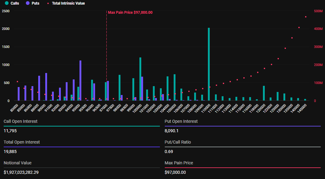 SponsoredPer Bitcoin, le opzioni in scadenza hanno un punto di massimo dolore (prezzo di esercizio) di 97.000 USD e un rapporto put-to-call di 0.69. Questo indica un sentimento generalmente rialzista nonostante la lotta in corso della crypto pioniera per riconquistare il traguardo dei 100.000 USD.