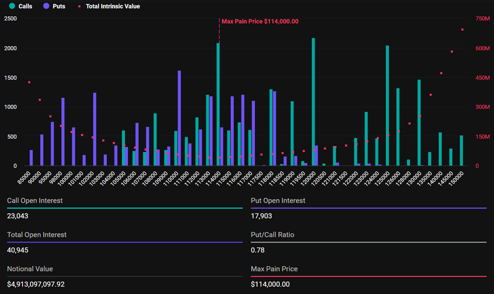 Il punto di massimo dolore, che è il prezzo al quale la maggior parte delle opzioni scade senza valore, è un impressionante $114.000. Questo è significativamente al di sotto dei livelli spot attuali, con BTC che viene scambiato a $120.259 al momento della scrittura.