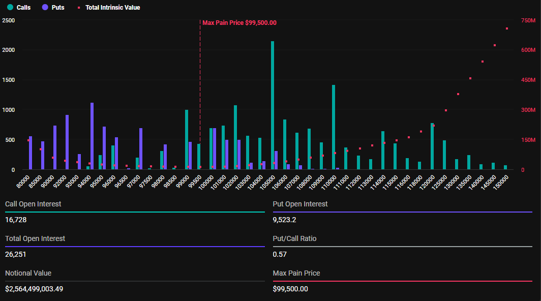 I dati rivelano anche che il punto di massimo dolore (max pain) per queste opzioni in scadenza è di 99.500 dollari. Il punto di massimo dolore è il prezzo al quale l’asset causerà il maggior numero di perdite finanziarie ai detentori.