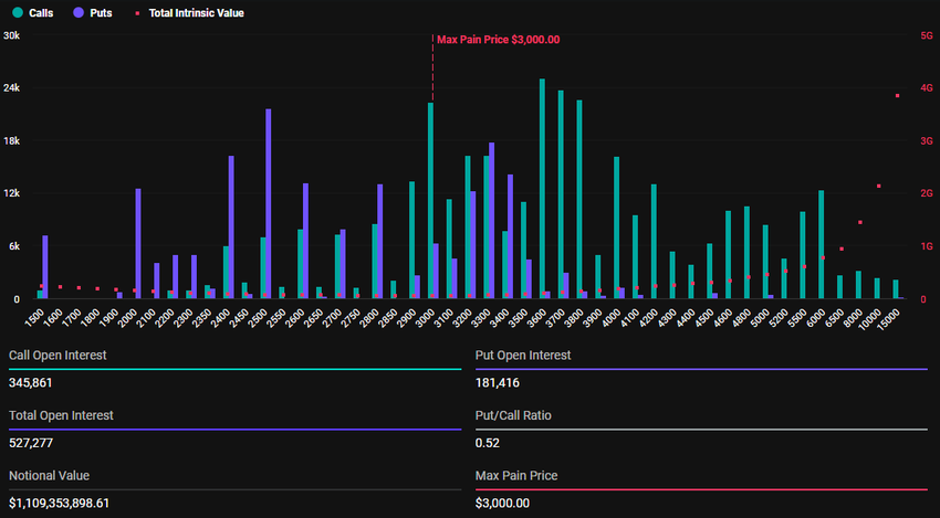 Oltre alle opzioni Bitcoin, 527.277 contratti di opzioni Ethereum sono in scadenza oggi. Queste opzioni in scadenza hanno un valore nozionale di $1,109 miliardi, un rapporto put-to-call di 0,52 e un punto di massimo dolore di $3.000.