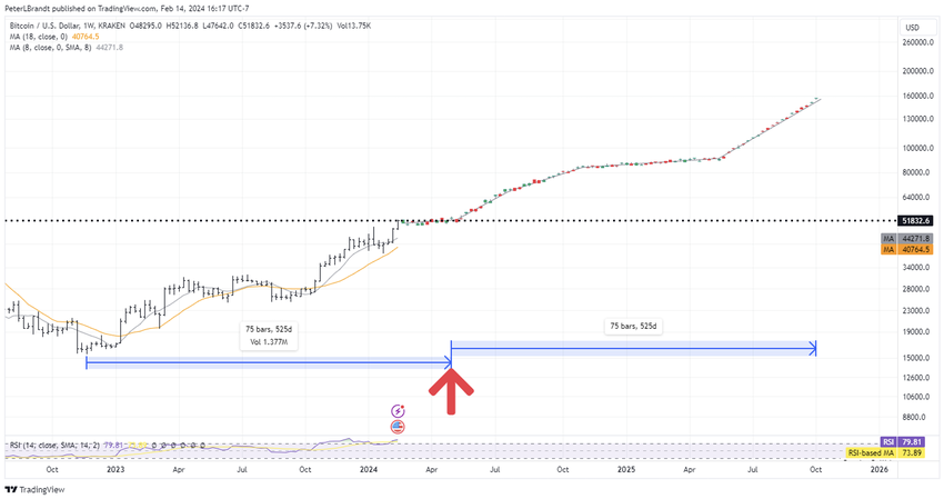 L’esperto di scambiare ha sottolineato la simmetria storica nella durata dei rialzisti prima e dopo ogni dimezzamento. Con il prossimo dimezzamento previsto per l’aprile 2024, le proiezioni di Brandt suggeriscono una prospettiva rialzista per il Bitcoin.