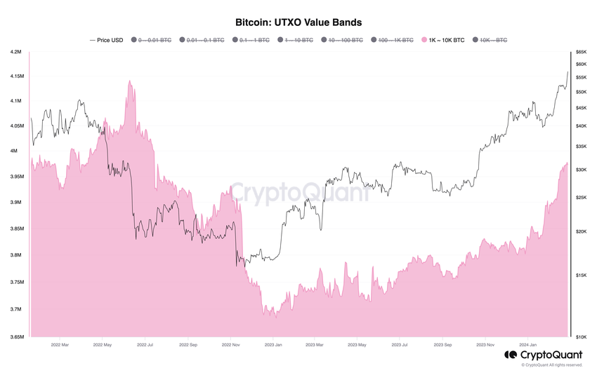 “Le disponibilità di Bitcoin di grandi entità sono cresciute fino a raggiungere il livello più alto dal luglio 2022, per un totale di 3,975 milioni di Bitcoin. Le partecipazioni sono aumentate costantemente dai minimi di 3,694 milioni di Bitcoin del dicembre 2022. L’espansione delle partecipazioni di grandi entità (da 1.000 a 10.000 Bitcoin) è correlata a un aumento dei prezzi, in quanto denota una crescente domanda di Bitcoin a scopo di investimento”, hanno dichiarato a BeInCrypto gli analisti di CryptoQuant.