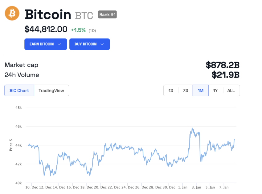 Mentre la comunità prevede l’approvazione a breve di un ETF sul Bitcoin, il prezzo del BTC scambia a quasi 45.000 dollari.